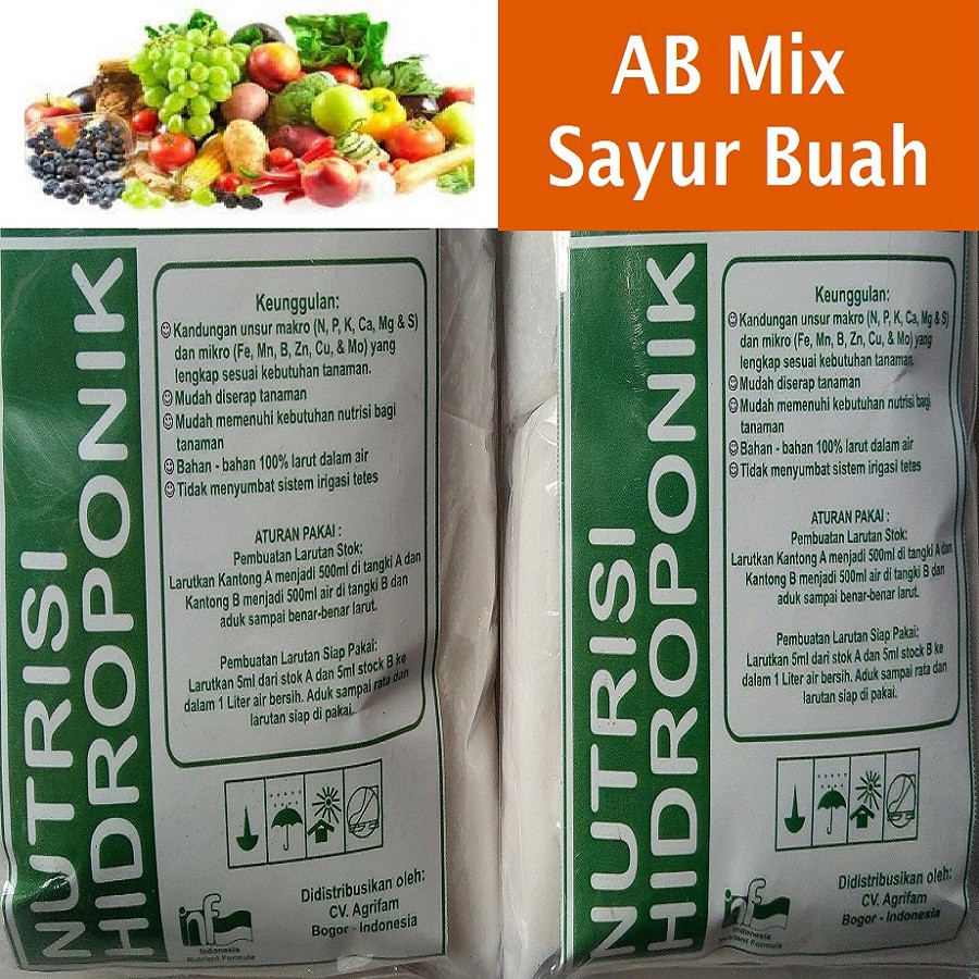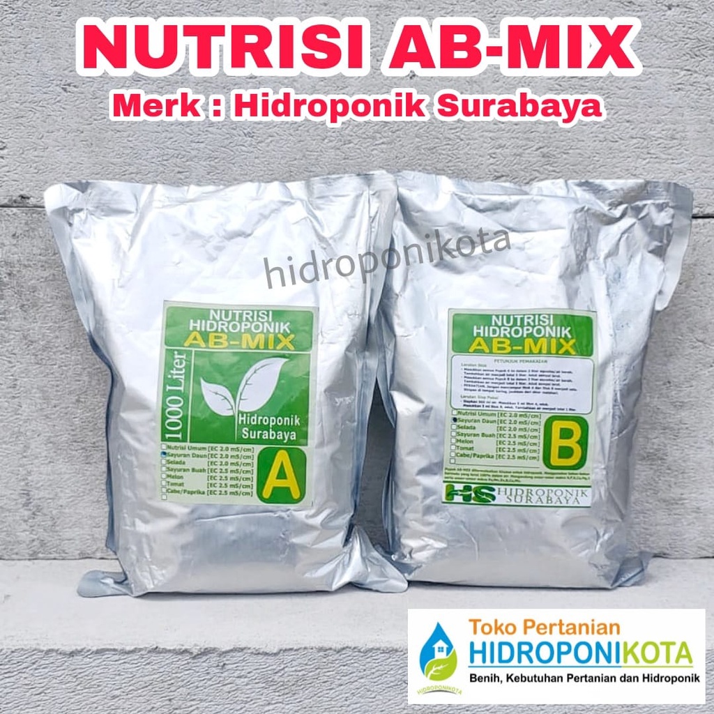 Harga NUTRISI HIDROPONIK AB MIX kemasan 250 gram. Nutrisi Hidroponik AB-MIX CAIR Sayuran 1 Liter A dan 1 Liter BRp35000. Ia boleh didapati di kedai-kedai pertanian yang membekalkan keperluan hidroponik dan fertigasi.