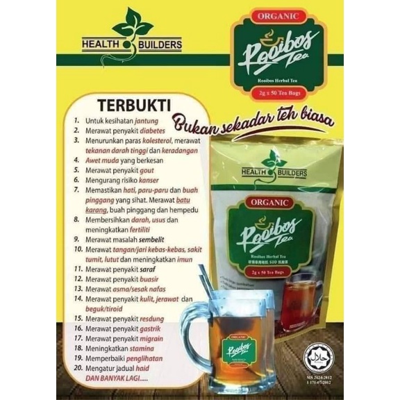 5 Sebab Utama Mengapa Teh Rooibos Organik Health Builders Mempunyai Nilai Khasiat 1. Ditanam dan tumbuh secara organik untuk kesegaran mutu yang lebih baik. Sama seperti teh pada umumnya teh rooibos juga menawarkan sejumlah manfaat untuk tubuh dan kesehatan Anda.
